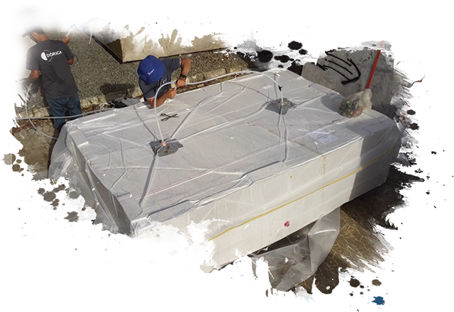Envolva seus blocos com nossa tecnologia convencional, utilizando FIBRA DE VIDRO e MASSA EPÓXI Dórica. Garantimos a proteção das chapas na serrada, seja através do tratamento no tanque com ácido ou da aplicação manual.